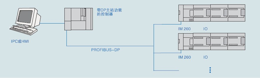 在使用IM260之前,需在软件上安装IM260相应的GSD文件。IM 260模块GSD名称为“PROFIBUS-DP接口模块(IM260)GSD文件”,您可在网址www.unimat.com.cn下载。通过IM260接口模块,可以让PROFIBUS-DP的网络中的主站来远程操作UN200扩展模块的I/O口。通过IM260从站模块的DP端口,可连接到PROFIBUS-DP网络的DP主站上,与同一网络上如315-2DP等其它DP主站进行通信。下图是一个IM260通讯的基本PROFIBUS-DP网络图。
