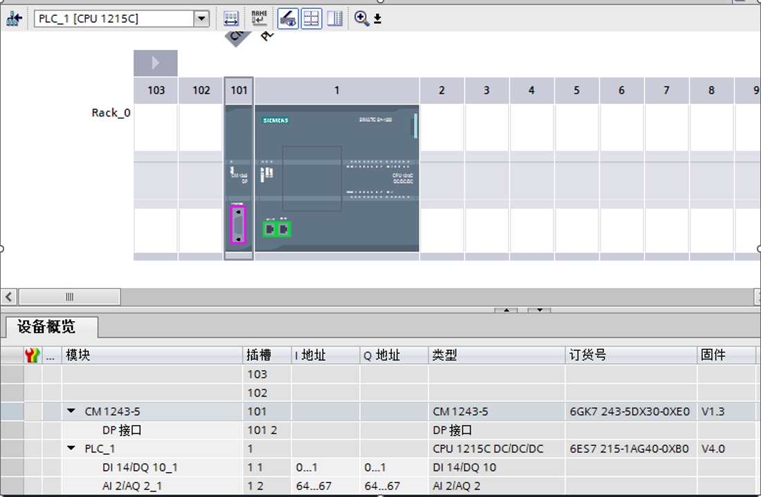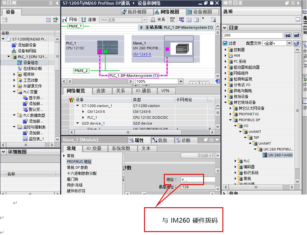 4、打开网络视图,添加IM260 DP从站,双击DP从站模块IM260,设置DP从站的地址。