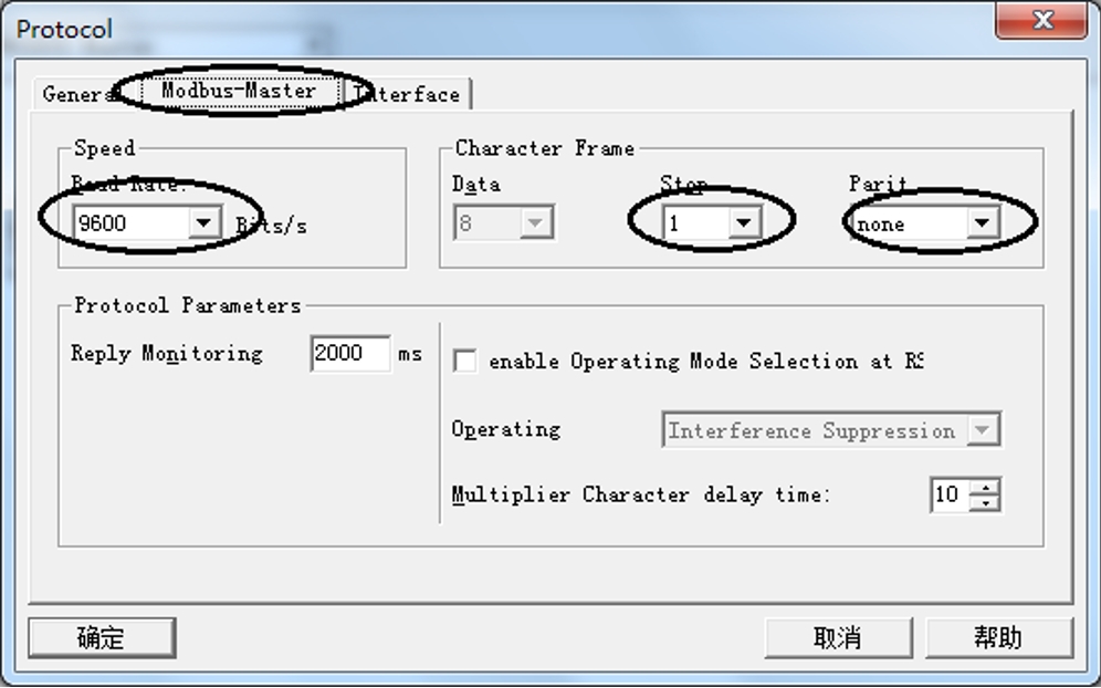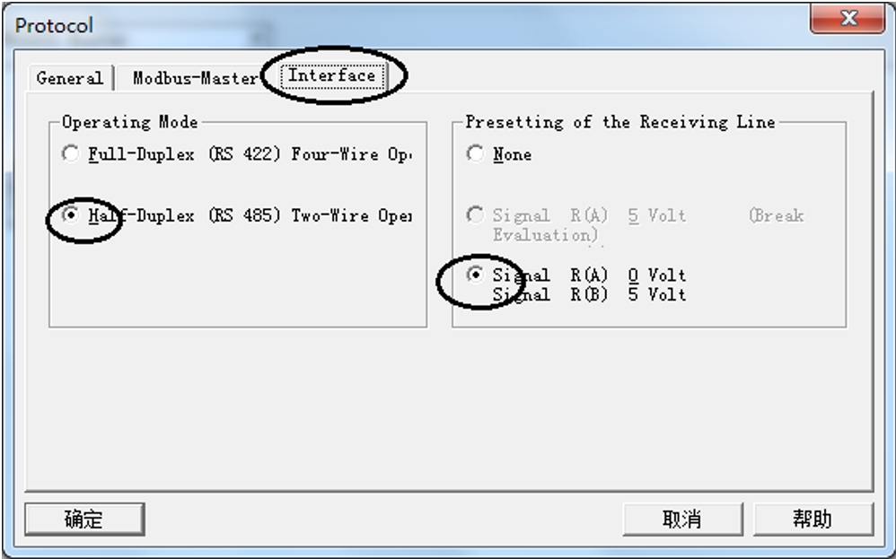 6、点击“Interface”按钮,进入RS485通讯模式画面。点击确定,返回参数设置对话框,点击“保存”保存所修改参数。如上图点选:半双工、A-/B。