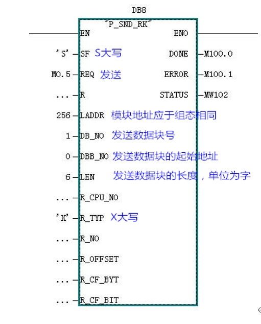 网络3:点击“库”>>CP PtP >> CP341>>FB8,调用FB8模块,并创建背景数据库DB8,如下图设置各管脚参数。参数说明如下表