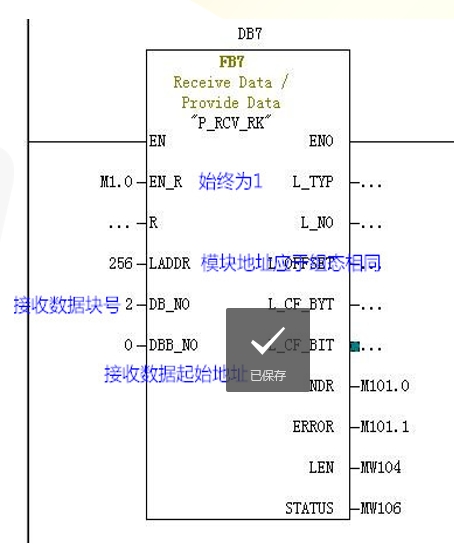 网络4:与网络3类似调用FB7模块创建背景数据块DB7,将接收的数据存放于DB2中。