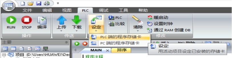 3、栏目上方依次选择 plc—设定—PC端的程序储存卡