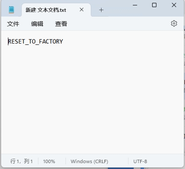 1、打开根目录,新建文本文档,并将 RESET_TO_FACTORY 输入到文档中并保存。