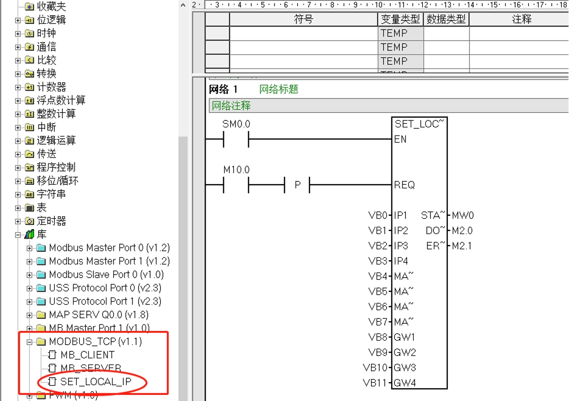 通过库指令SET_LOCAL_IP来设置CPUIP地址。如下图,相关接口填入地址,并且在触摸屏上关联相关地址。填入新的IP地址、子网掩码、和网关地址后,通过触发M10.0产生上升沿,设置CPU新的IP。然后CPU断电重启后,新的IP生效.